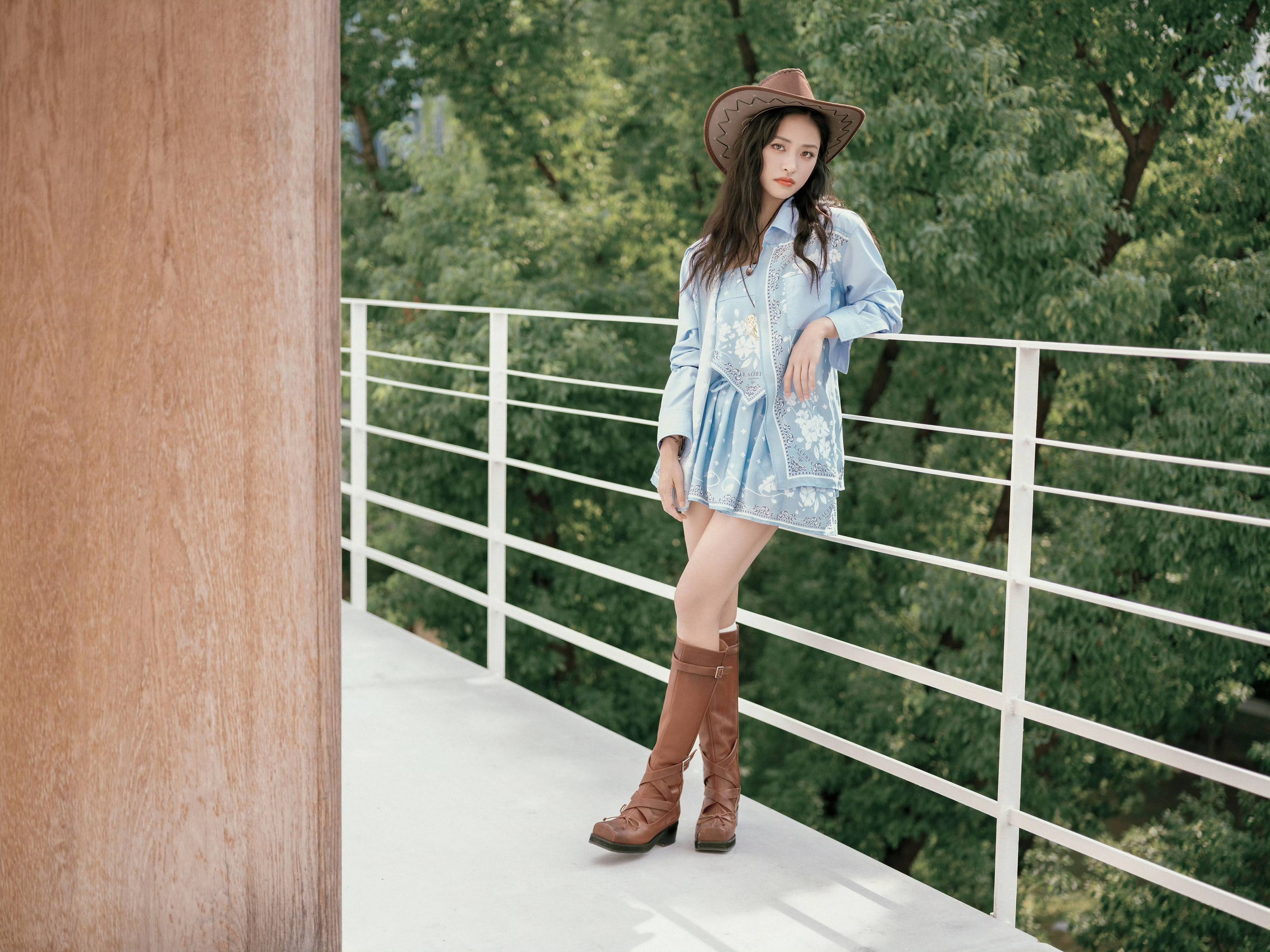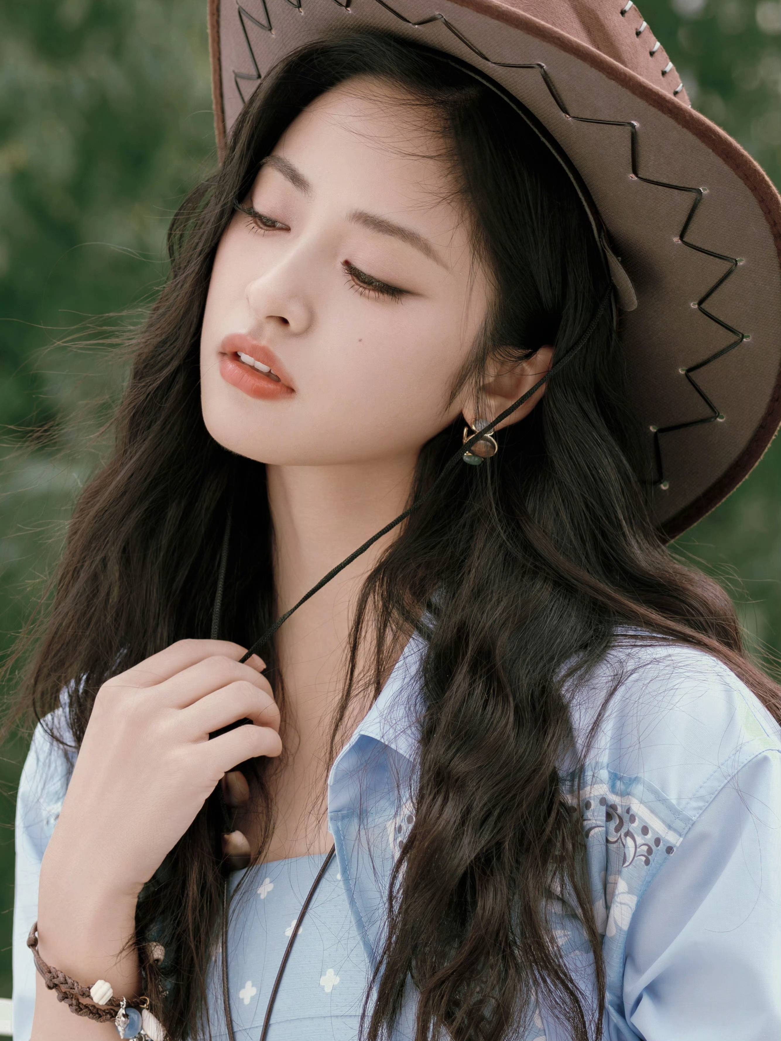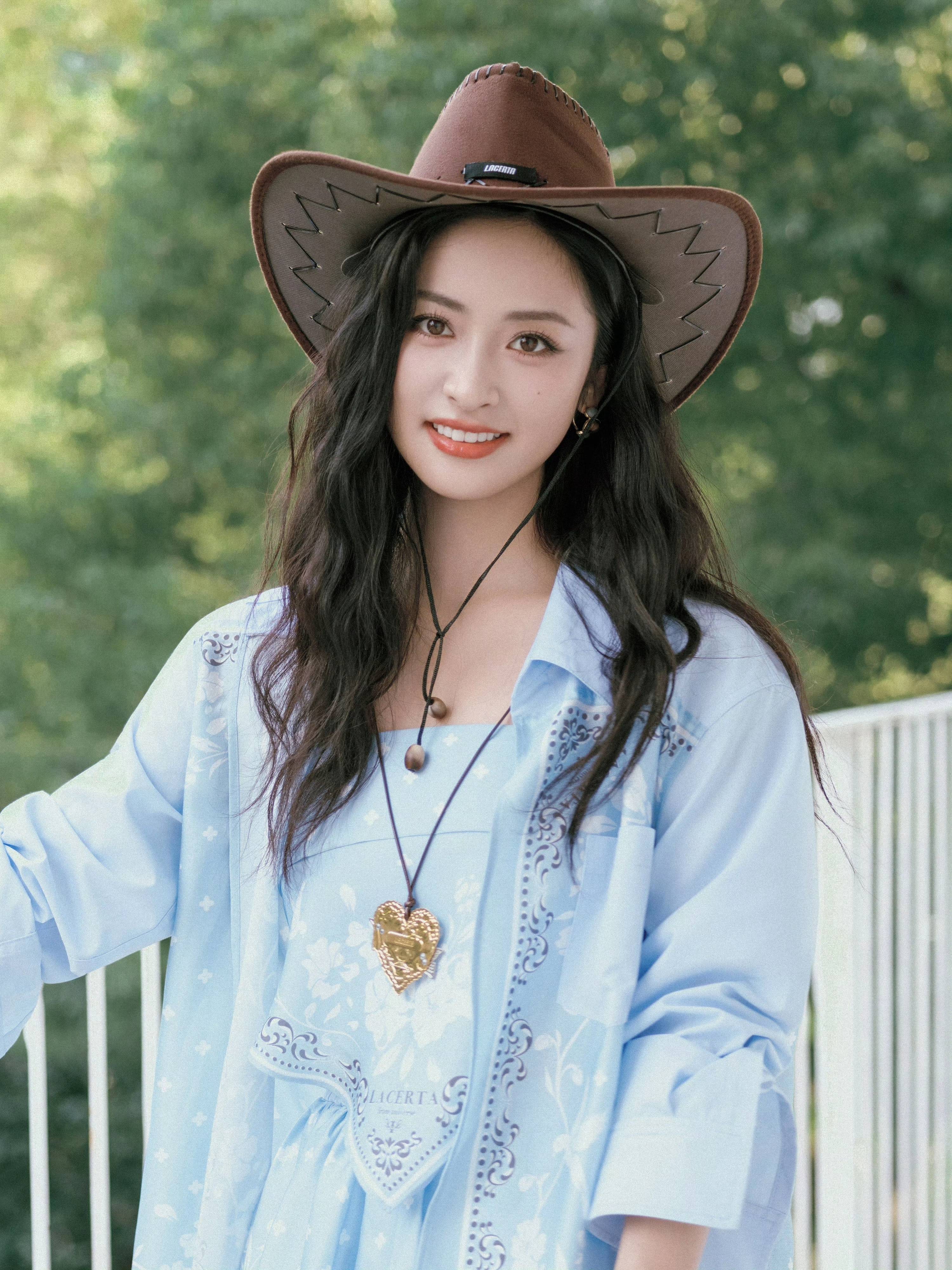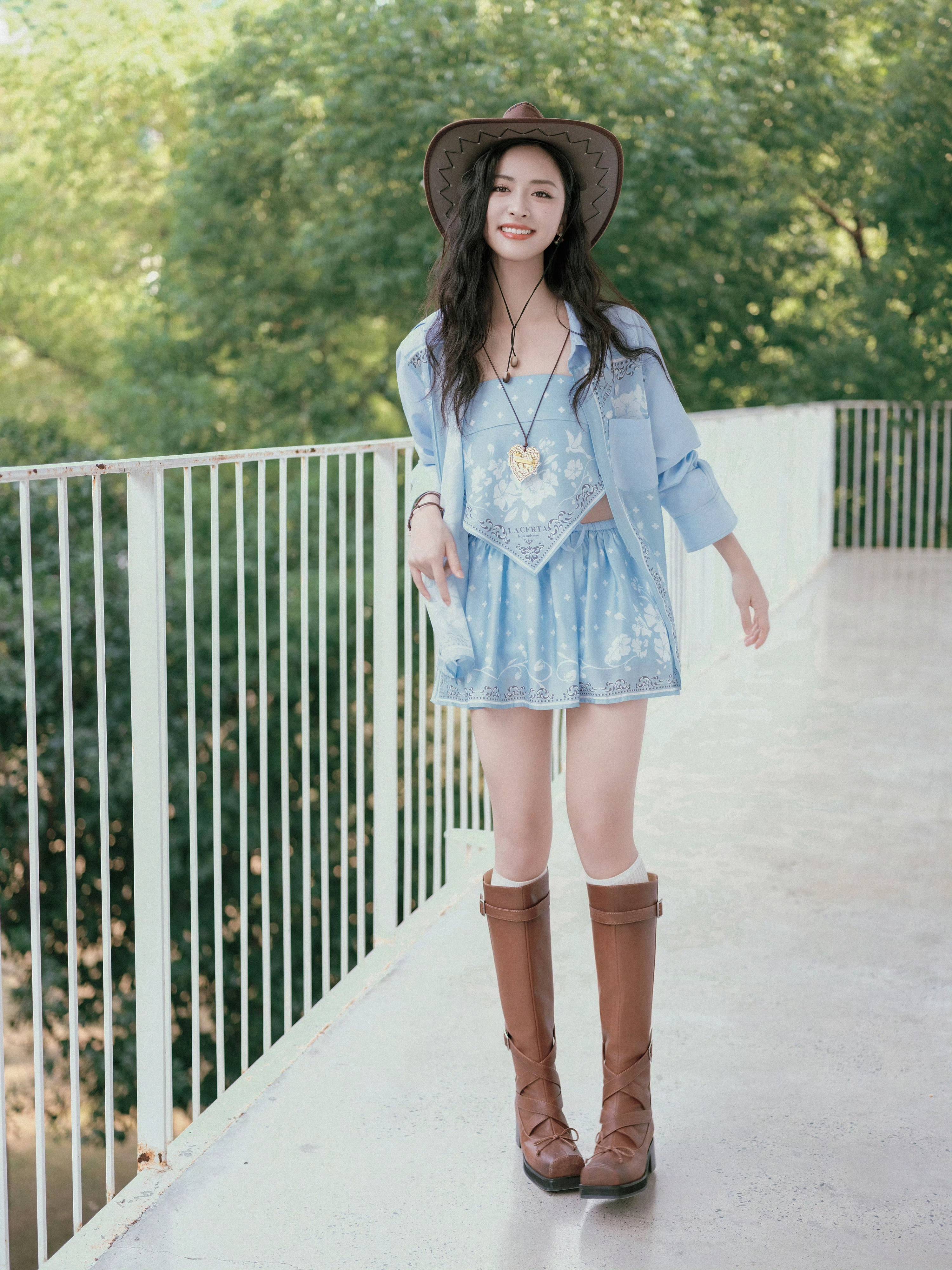 仔帽与长靴锚定复古腔调;心形金属链饰与编织腕饰点缀细节,在绿意背景里,把美式自由与少女甜俏揉成穿搭配方,每一次摆动都是荒野浪漫的鲜活注脚。